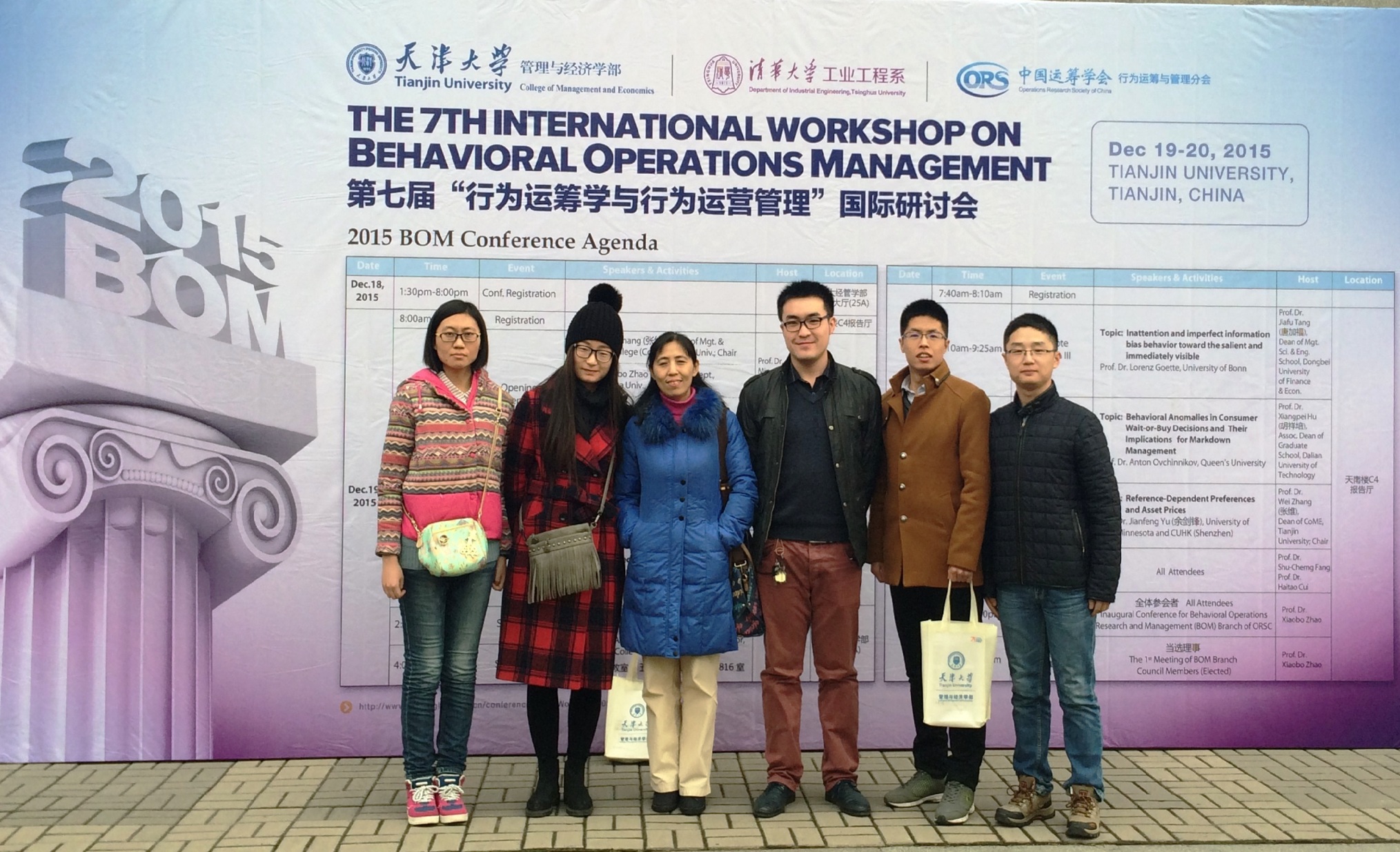 2015年12月19日-20日,由翟晓英老师带队,李林波、马庆庆博士和裴鑫建、李娜、赵宇硕士组成的行为金融学研究团队参加了在天津大学管理与经济学部举办的第七届“行为运筹学与行为运营管理”国际研讨会。该会议由天津大学管理和经济学部、清华大学工业工程系和中国运筹学行为运筹与管理分会主办,行为金融和行为经济学领域的研究在本届研讨会上被列入会议重要主题。