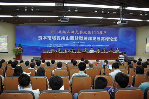 为贯彻落实山西转型发展的战略需要,增强服务地方经济社会发展的办学功能,同时为我校建校110周年献礼,5月5日上午,我校在会议中心博雅报告厅隆重举行资本市场支持山西转型跨越发展高峰论坛。本次论坛由山西大学、中国证券监督管理委员会山西监管局、山西省发展和改革委员会、山西省政府决策咨询委员会办公室主办,我校管理学院承办。郭贵春校长出席了论坛开幕式。刘维奇副校长致欢迎辞。中国证券监督管理委员会研究中心主任祁斌,证监会山西省监管局局长孙才仁、副局长赵志明、副巡视员贾岷岫,山西省工商业联合会主席张复明、中国社会科学院财经战略研究院副院长史丹、国务院发展研究中心宏观经济研究部副部长孟春、山西通宝能源股份有限公司总经理李明星、山西省发展与改革委员会资本办主任魏茹生等领导和嘉宾莅临论坛共商转型大计。部分资本市场从业人员、企业家及我校各院系师生代表参加了论坛。论坛由管理学院院长李景峰主持。